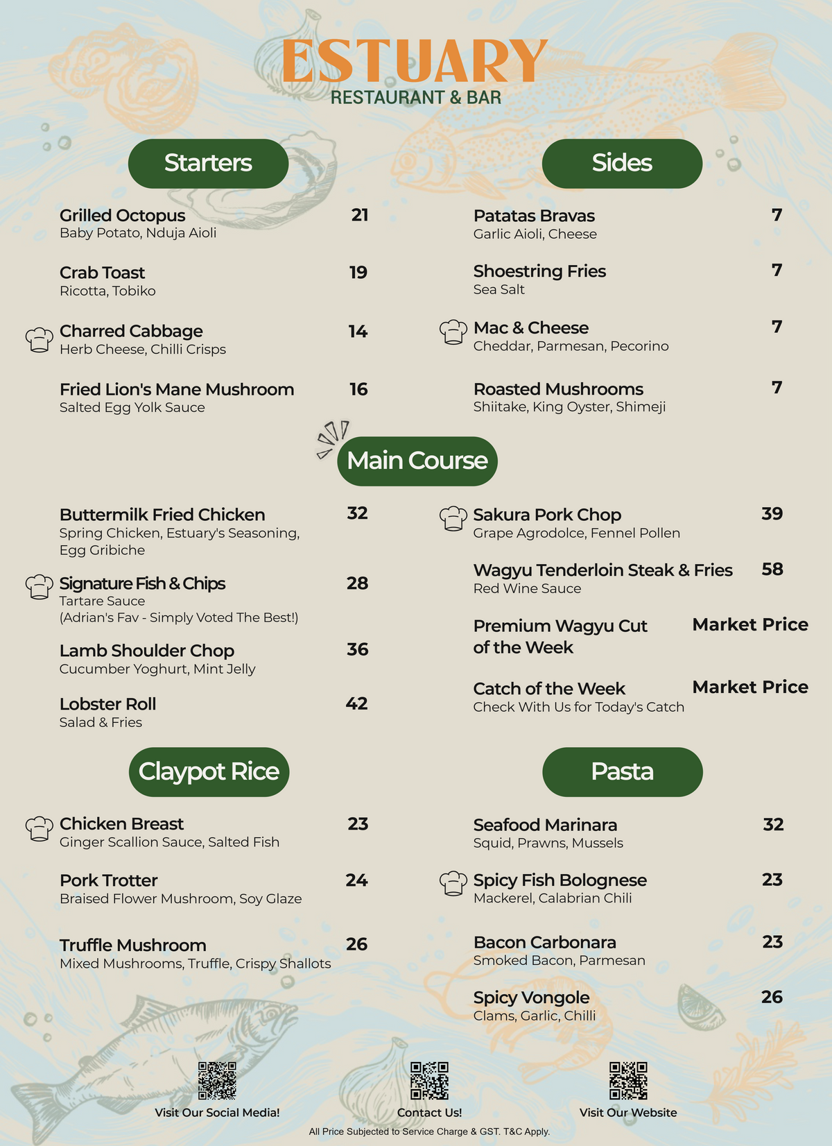 His speciality lies in seafood & grilled greens.
